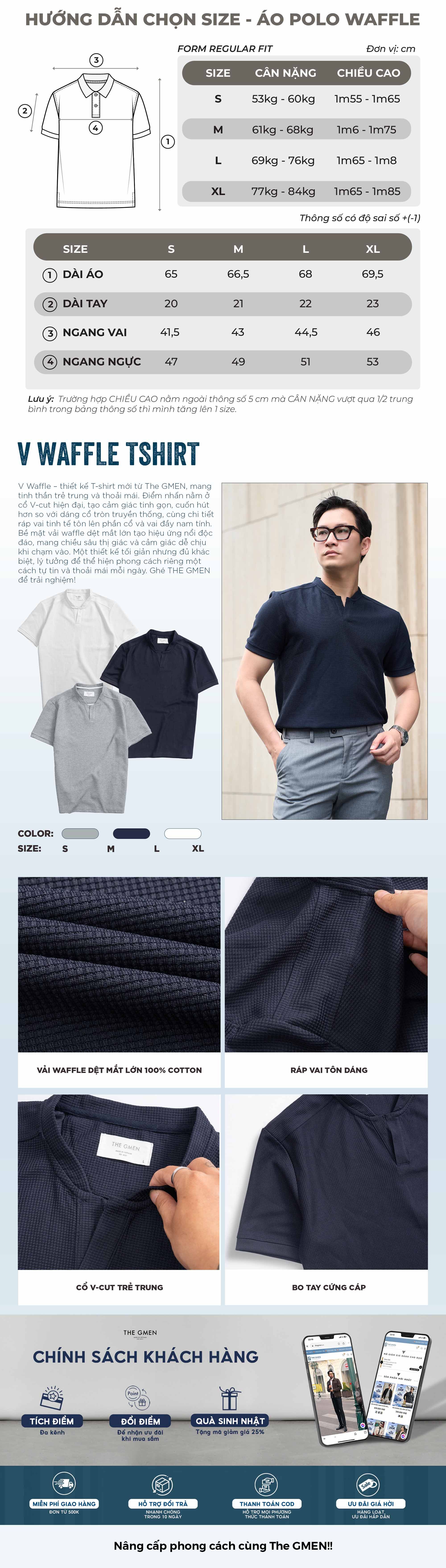 - Cổ V-cut trẻ trung - Ráp vai tôn dáng - Bo tay cứng cáp - Vải Waffle dệt mắt lớn 100% cotton: mềm mịn, thoáng mát. - Công nghệ xử lý vải hiện đại – không co rút, hạn chế phai màu.